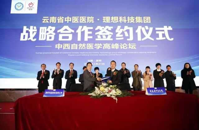 云南省中医医院、云南中医学院第一附属医院、云南中医学院临床医学院党委副书记、院长温伟波与理想科技集团副董事长焦少良上台签字,共同完成战略合作签约仪式,标志着云南省中医医院与理想科技集团正式携手合作,共谋发展,为中国中医药的崛起、为人类的健康担同一份责、树同一个梦。理想为广大理想家人们打造一个自然、安全、全民共享的健康管理中心。理想家人们在家创业的同时就可以享受到专业的康复保健与医疗服务。同时理想将大力开发中医药特色技术等优质中医诊疗项目,以健康美丽的产品,360度的茶生活方式,推动理想大健康产业升级。