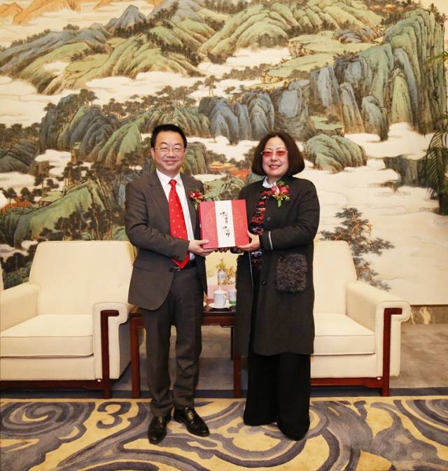 理想科技集团副董事长焦少良(左)向云南省中医医院、云南中医学院第一附属医院党委书记陈燕溪(右)赠送“中国理想·中国梦”纪念茶