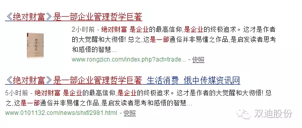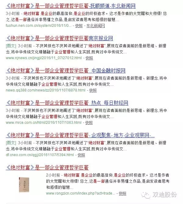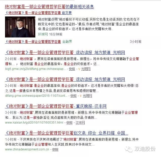 《绝对财富》其中不惜篇幅,对绝对财富进行了反复论证,全书二十五章一百二十节专门论述就有二十六节之多,如“吹响绝对财富的集合号”、“绝对财富的主体是人”、“绝对财富为谁而写”以及“绝对财富的意义”等等,作者说“真正的财富在哪里?在我们心里”,心有大未来,心有大财富,心里有就什么都有!并对绝对财富点明“绝对看似不可以动摇,实际它也是生动活泼的,它也处在不断变化中的,它也是辩证的——”最后,作者点明,“绝对财富”是企业的最高信仰,是企业的终极追求。这才是作者的大觉醒和大彻悟!