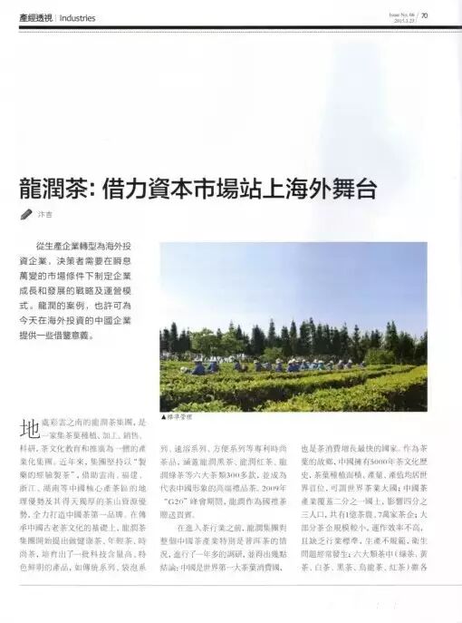创刊于1947年初的香港《经济导报》,是香港历史最悠久的中文财经杂志,在今年3月23日出版的第6期内容中,特别报道了地处彩云之南的龙润茶集团,描述其坚持走产业化集团化发展之路,借力国际资本市场,促进自身业务腾飞,打造出国内外知名的茶叶品牌。