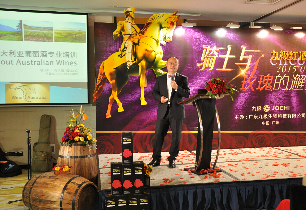 九极健康,相约红酒,8月15日,骑士与玫瑰的邂逅——九极红酒发布会在广州五星级酒店,圣菲索特大酒店隆重举行,九极公司从澳洲原瓶进口的王室公爵干红与玫瑰希拉干红两款红葡萄酒终于揭开其神秘面纱,与各位九极家人见面啦。