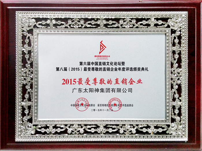 该活动自2008年开始至今,已成为直销界一年一度的思想盛宴。“最受尊敬的直销企业年度评选颁奖典礼”是2015年行业英雄风云际会的舞台,太阳神再次走上荣耀的殿堂,连续两年荣获“最受尊敬的直销企业”大奖。十一年来,太阳神直销在创新经营、永续发展、环境友好、公益慈善等多方面卓越的表现,诠释着“最受尊敬”的内涵与意义,获得了社会各界的认可和尊敬。