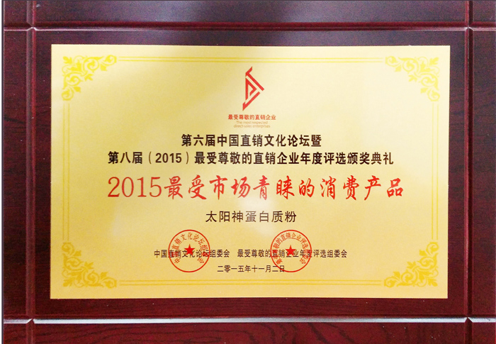 惊喜与收获接连不断,11月初,由中国直销研究院、当代直销全媒体中心、中国直销文化论坛组委会主办的“第六届中国直销文化论坛暨第八届(2015)最受尊敬的直销企业年度评选颁奖典礼”在北京隆重召开。中宣部舆情局、国家机关事务管理局、公安部办公厅、国家工商总局、中央电视台新闻中心、新华通讯社、人民网等30多家主流媒体单位领导出席了此次会议。太阳神凭借这一年的突出表现,荣获“2015最受尊敬的直销企业”,太阳神“蛋白质粉”荣获“2015最受青睐的直销产品”殊荣。
