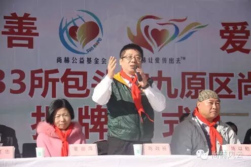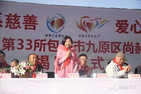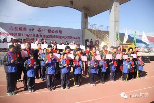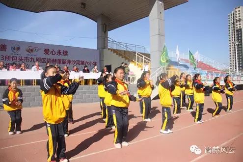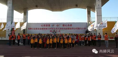 2015年10月28日,尚赫第33所公益小学——內蒙古包头市九原区尚赫董丽萍沙河第六小学圆满地举行了揭牌仪式,这也是坐落在“尚赫公益大道”上的第七所尚赫公益小学,1400余名尚赫的爱心志愿者来到这里,与全校师生一同点燃爱的火焰。正值十月金秋时节,当地的气温已达零下3℃,尚赫人相聚在一起,把融融的暖意汇集在一处,铸就尚赫公益的大爱景象。