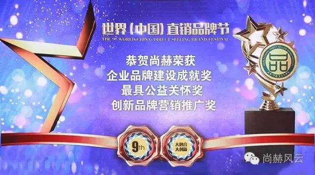 2016年6月18-19日,第九届世界(中国)直销品牌节在武汉隆重举行,这是一次行业权威交流盛会,直销界知名人士、专家齐聚一堂,以“大融合·大创新”为主题,探讨在新的社会背景下的直销产业、渠道融合及模式、技术创新等问题。尚赫品牌应邀出席会议,并荣膺多重奖项,展现品牌实力与事业魅力。